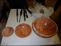 Bowl Turning - Bob Sawyer set out to demonstrate the worth of a bowlsaver tool. He uses a 'Woodcut' but there are other makes. In this case he had obtained three bowl blanks from one large one but it is possible to obtain even more. He had already turned the large and medium blanks into fine bowls leaving the smallest as his demonstration sample for the evening.