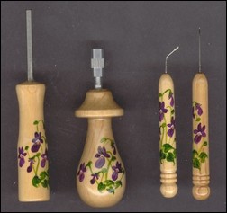 Using slides Ron then took us through the wide variety of bobbin designs that have evolved in various lacemaking centres in the UK and abroad including some turned in bone instead of wood. The anatomy of a bobbin includes the head, a neck, a collar the shank and an optional spangle. Design details included tiny inserts in the bodies of some bobbins, loose captive rings (jingles) and the use of a small hole drilled through the bottom detail of the bobbin for the insertion of a wire that is then shaped into a circle on which spangles (typically coloured beads) of the laceworkers' choice have been threaded. This assists identification of individual bobbins, which are almost always used in pairs - plus the weight of the bobbin tensions the thread. A huge variety of commercially made bobbins are available - to include painted, carved and commemorative ranges. There are a number of special tools used to assist the lace maker.