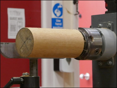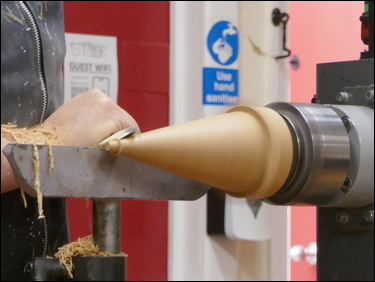 Bryan started with a piece of oak approx. 3" square by 8" long, mounted between centres. Using a spindle roughing gouge he trued it to round, squared the end and cut a tenon on the tailstock end. Now mounted in a 4-jaw chuck - the tailstock end was trued with a skew chisel and a groove cut near the chuck to provide some 'working room.' The cone shape was roughed out with the spindle roughing gouge and then finish turned smooth with a skew. Bryan provided plenty of tuition basics along the way - marking a black line on the centre of the skew (the woodturners plane) to emphasise the 'pivot' point, and showed how easy it was to get a (deliberate) catch in the work. The cone was sanded through the grits to finish. Bryan then applied white vinegar rubbed into the grain with wire wool to achieve a blue/ black stain, produced by the vinegar and wire wool reacting with the tannins in the oak. The cone - still mounted in the chuck was removed from the lathe.