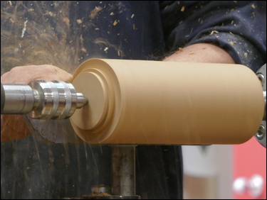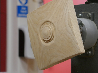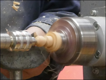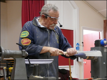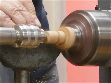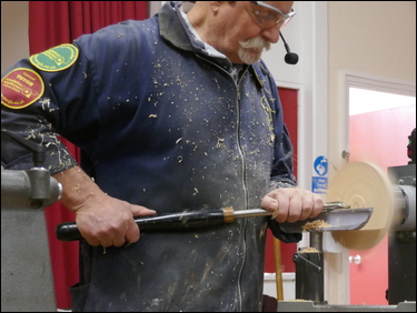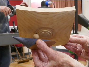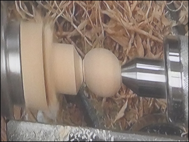The third component was the making of a small 19 mm diameter sphere. A piece of ash - 1 ¼" square by 2 ¼" long was held between centres, one end was rounded and a spigot was cut for a 4-jaw chuck. This was then mounted in the chuck and a 5 mm diameter hole was drilled through the part. Tailstock support was provided and Bryan proceeded to turn a sphere, utilising a skew chisel. The sphere was finish sanded and was then parted off with the skew, into the drilled hole.