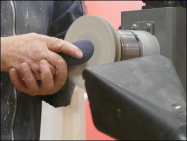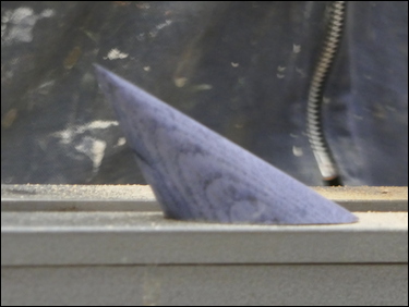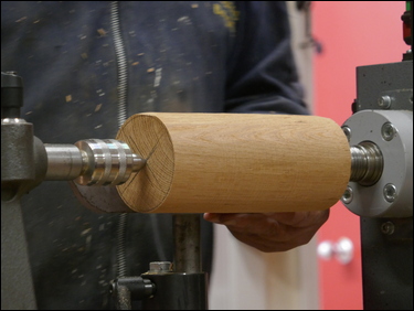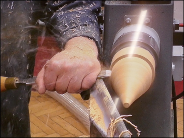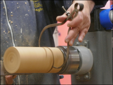The cone and chuck were re-mounted on the lathe, and the spindle was locked in position. Bryan then used a fine-tooth, Japanese pull-saw the cut the cone off at an angle. A home-made, Velcro faced sanding disk was mounted in the chuck and the base of the cone was finish sanded.