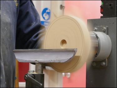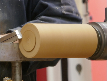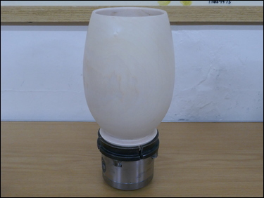 The bowl was re-mounted in the 4-jaw chuck, on the spigot to enable the piece to be hollowed. A bowl gouge was used throughout the hollowing process, with multiple checks carried out on the wall thickness being made, and hollowing to achieve a constant wall thickness, which resulted in parallel edges on the bowl. The bowl was then power sanded through the grits.