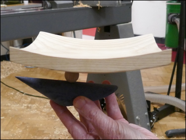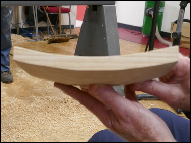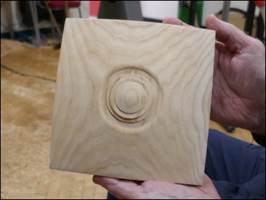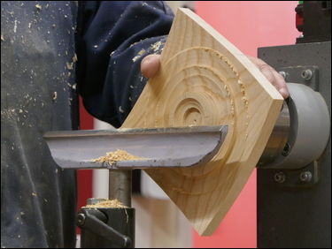 The ash bowl blank, cut accurately to 7" square by 2" thick, was mounted in a 30 mm diameter Forstner bit hole - that had been previously drilled on a drill press - on a 4-jaw chuck. An angle was cut on the front of the blank, attempting to match the taper angle of the cone. Bryan emphasised the danger of the rapidly spinning corners of the blank - and stressed the need for caution when turning in this area. It was suggested that a piece of tape should be applied to the toolrest to define the closest a hand/ fingers could travel along the toolrest, and stay safe. The part was power-sanded as far as possible - then the 'corners' were sanded with the spindle stopped. A decorative feature - several grooves and a rounded end were cut into the base of the bowl. One of the 'grooves' was sized to produce a spigot to fit the jaws of a 4-jaw chuck. These were all finish sanded.