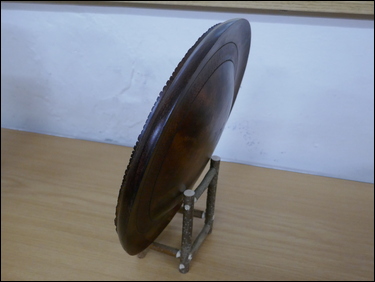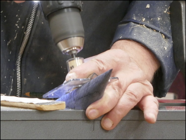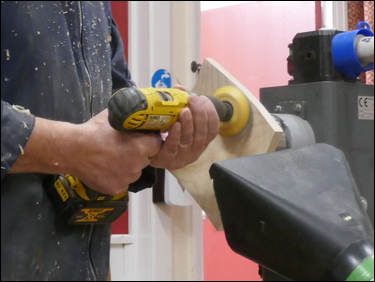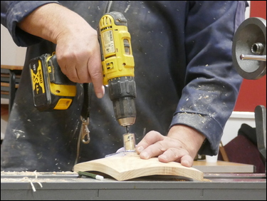 Next, the assembly of the three component parts. Bryan marked the position for the hole and then used a very simple drill guide kit - where a bush mounted in the guide, was held onto the cone shape. The guide held the drill square to the surface as Bryan drilled a 5 mm diameter hole. The marking out and drilling was then repeated on the underside of the bowl. A 5 mm diameter brass rod was cut to length and the three components were assembled using CA glue.