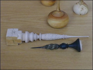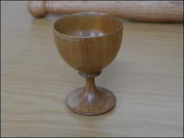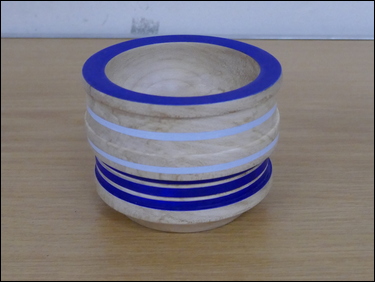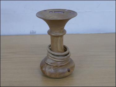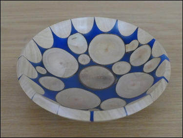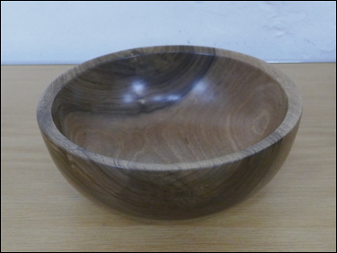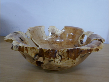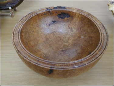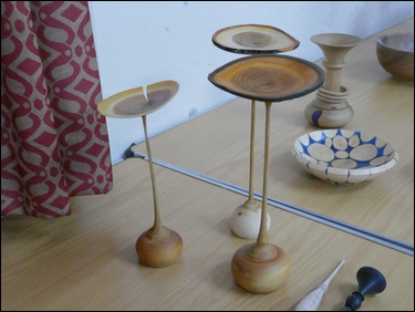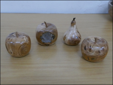 Martin Barrett had several items on display, where he showed the marking-out of a blank and the finished result of the making of spiral flute finials. He also showed three very thin stemmed goblets made from wet cherry. Dave Branscombe presented a composite resin and timber slices bowl made in silicon rubber mould - and then turned. His second item was a small elm vase holding three captive rings. Ayhan Dawood showed an experimental practice piece, where he used colour and Milliput epoxy putty in the making of a small straight sided cup. Steve Alexander displayed several apples and a pear made from the branch of a Bramley apple tree. Tim Mortimer presented a walnut bowl, along with a large, tall, thin-wall, sycamore vase. He was looking for suggestions as to what to do with it next? The consensus of opinion said that it should be stained/ coloured. George Gansbuehler showed an oak, skew chisel practice piece - where he had made a rounders bat. He had also made a small weed pot, made from a hornbeam branch, rescued from a Council skip. John Lockhart placed three items on the table - the first was a small thin-wall goblet made in cherry, the second was a fine bowl made from a horse chestnut burr and the third was a very large salad bowl made from an apple burr - utilising a bowl saver to get the most timber out of the wood. Frans Brown presented a large sycamore, shallow bowl, that he had turned, textured, carved, stained and pyrographed to create different decorative effects on its surfaces. The back of the bowl was rounded and had also been textured. Don Webster showed a large yew root bowl, that owing to its delicate and holey nature had taken him a 'while' to make. The surface finish was a number of coats of finishing oil.![]() |