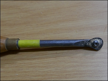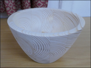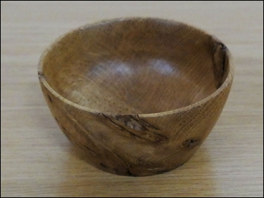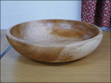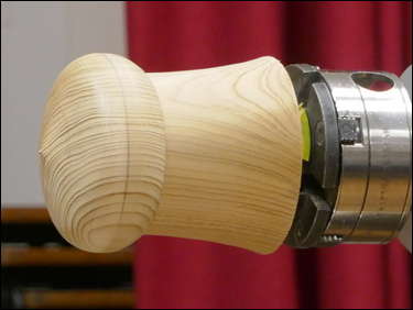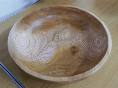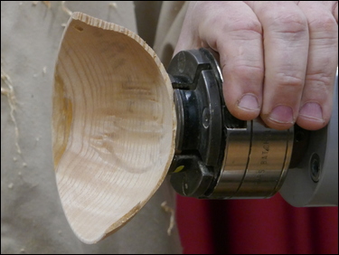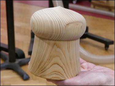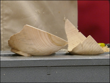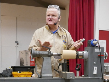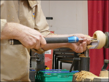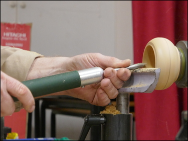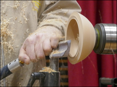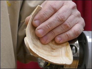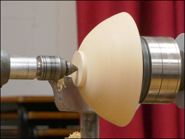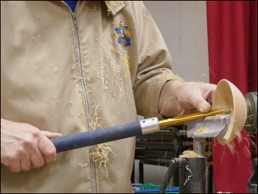 A previously part-turned bowl was mounted on a driving pommel held in the chuck and supported by the tailstock - to enable the holding spigot and the outside shape of the bowl to the cleaned up. The bowl was then held in the chuck. Les then proceeded to turn the wall thickness to be 'very thin' - using a bowl gouge and his left hand to support the wall as it was turned. He then picked up his multi-purpose tool and declared that this is how it can be used to judge the wall thickness - by giving the bowl an almighty whack (surprise, shock, awe, horror in the audience!) - breaking it neatly into two pieces. Yes - it did show Les's skill at turning a thin, constant wall thickness bowl using his 'fingers' as calipers. It was an impressive and entertaining demonstration of his skills. An alternative technique is just to cut the bowl in two on the bandsaw to examine the wall thickness.