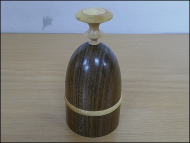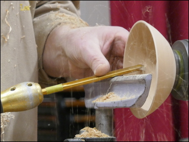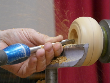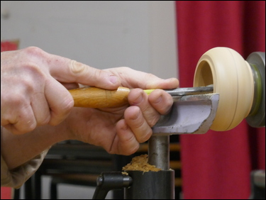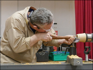 The lid was hollowed (end grain hollowing) - using a spindle gouge - working with the grain, from the centre outwards - and finally cleaned up with a 'teardrop' shaped scraper. Using his 'signature' round multi-purpose tool Les adjusted the fit in the lid to produce a tight fit on the base. The base was then mounted in the chuck - and the lid was then fitted to it. The lid was finish turned to shape, and sanded.