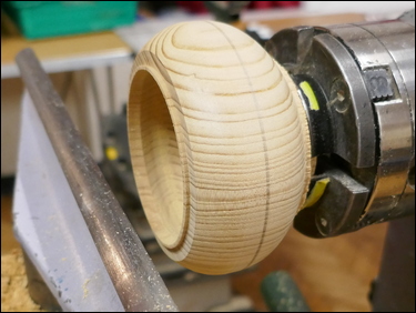 The lid was removed and the base was hollowed - initially with a spindle gouge, followed by a hollowing tool - to achieve a flat bottom and straight sides. The tenon diameter was adjusted (sandpaper) to produce the 'classic' suction fit with the lid.
