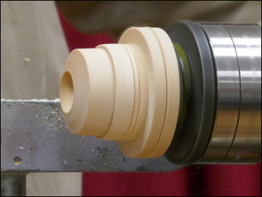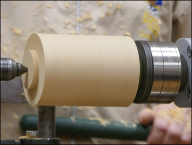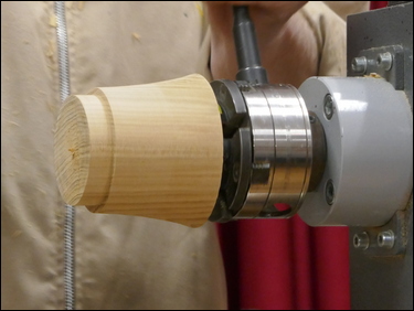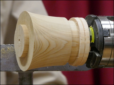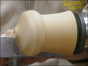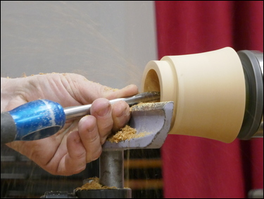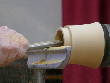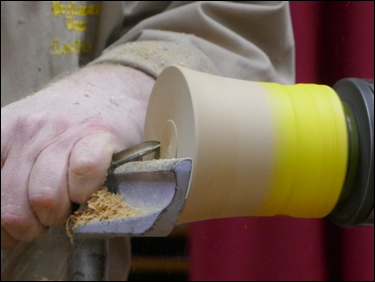 A piece of scrap timber was held in the chuck - and turned to be a tight-fitting jam chuck for the base - some 'safety' masking tape was applied to the join between the base and the jam chuck. The bottom of the box base was finish turned slightly concave. Les said that he would probably use an oil finish on the box.