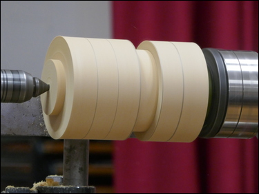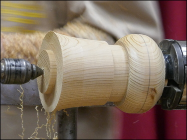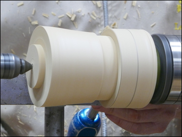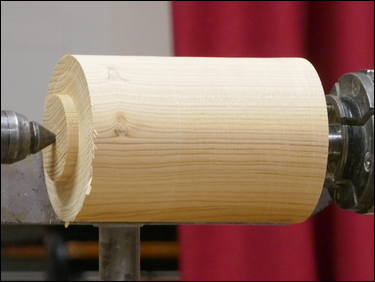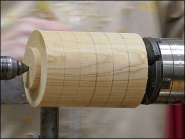 He started by holding the blank (approx. 3 ½" diameter by 7" long) between centres and driven by a Steb drive held in a 4-jaw chuck. The part was turned to round using a spindle roughing gouge - Les specified 'unravelling the wood' - cutting the wood how it likes to be cut(?) - present the tool correctly - and use all of the gouges cutting edge. He showed using a skew chisel (there is a lot more bevel contact) on the turned cylinder to get 'curly' shavings. A spigot was turned at the tailstock end and then held in the chuck. Another spigot was then turned at the tailstock end. The box would have a 2 fifths lid to a 3 fifths base - so the cylinder was marked out into 6 equals widths. The central section was turned down to what would be the box 'joining' tenon - and the box was turned to shape - and parted off - to leave a small 'witness' (tenon) diameter on the lid.