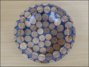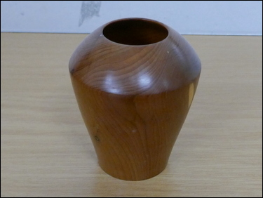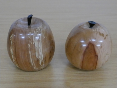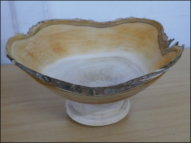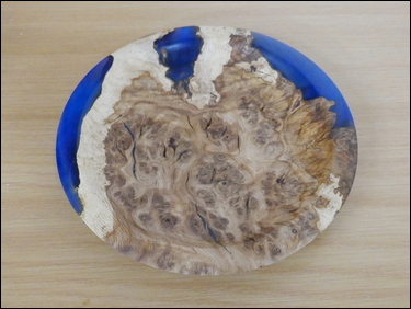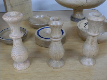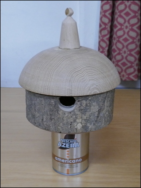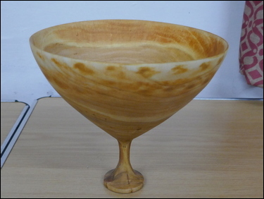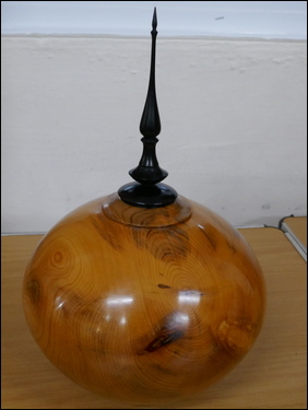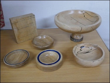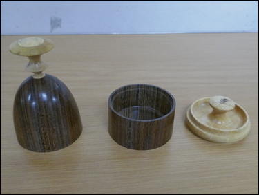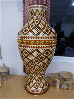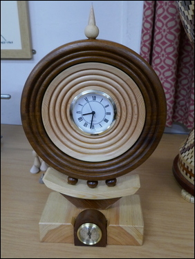 Tim Mortimer presented a large blue stained vase in sycamore, finished with acrylic lacquer purchased from Aldi - it produced an excellent result. Also, a large yew hollow form with a blackwood finial and an oiled finish. Dave Branscombe presented three items - a small platter with multiple wooden inserts, set in a blue casting resin - and turned. A large burr oak platter with a blue resin casting to replace some missing timber and a part-finished pine laminated bowl which was showing some interesting grain patterns. Martin Barrett also showed three items - two apples made in apple wood that were hollowed out to be salt shakers and two wet cherry, 'goblet' shaped, thin wall bowls - the one with the natural bark-on edge was unfinished. Don Webster displayed a very large Scottish wych elm, shallow fruit bowl, finished with sanding sealer and Woodwax 22. John Lockhart showed a small yew vase that was his first attempt at hollowing with a Simon Hope hollowing tool and a small thin-walled burr oak bowl. Frans Brown displayed a three-part box in African ovangkol timber with a boxwood inner tray and finial. Roger Hoare presented a huge segmented urn containing several thousand individual pieces of sycamore, purpleheart, blackwood, pau amarello, yew and mahogany - a lot of work and a great result. John Theobald displayed a bunch of practice pieces - some bud vases and small bowls made in ash from his firewood pile and a large spalted beech pedestal dish. Finally, two items from Paul Kohn - a large multi-component clock on a stand, with a finial and a barometer in the base. And a rustic bird box made in ash.![]() |