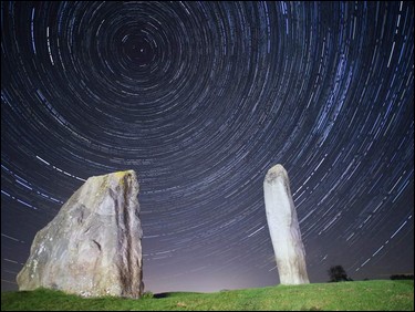 The photograph above on the left was taken at Coate Water (Swindon) and above right is a photo taken in Lechlade on the River Thames. Below, on the left photo was taken at the 'Adam and Eve Stones' at Avebury, Wiltshire. A total of 197 time-lapse exposure photos were taken - one every 25 seconds. They were then 'stacked' one on top of the other to produce a single photo - showing star trails, and the rotation of the earth. The photo on the right (below) was taken at Peatmoor Lagoon, West Swindon. |