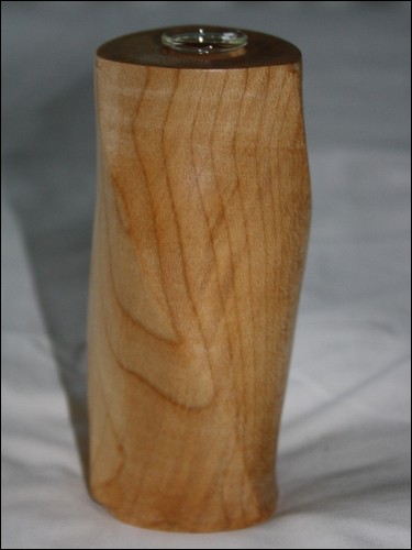 A twisted multi-centre (4 actually) bud vase with a glass 'test tube' insert. Made in Sycamore - finished with sanding sealer and wax then buffed. |